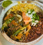 Homemade rice & beans, Al Pastor, mixed cheese, fresh lettuce, diced tomatoes, onions, cilantro & sliced avocado, served with sour cream & salsa verde on the side.