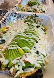 Homemade corn masa topped with black beans, chicken, topped with fresh lettuce, diced tomato, onion, cilantro. Finished with crema mexicana, queso fresco, & sliced avocado. Served with salsa verde on the side